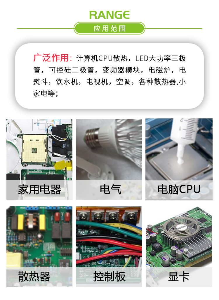 应用范围:广泛运用LED、电子电器(电磁炉、电冰箱、饮水机)、电气(开关电源、变频器)、电脑CPU、控制板、光纤通讯等