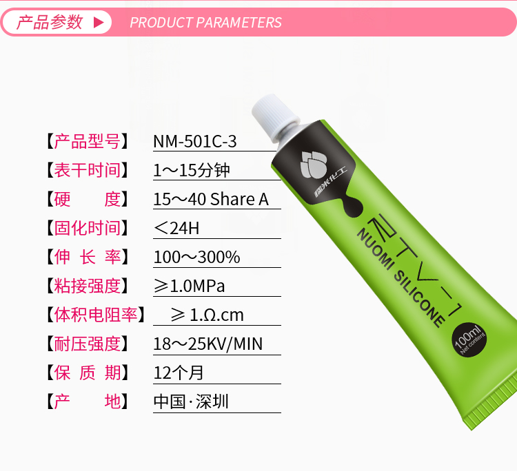 产品型号:NM-501C-3工作温度:-50~250℃固化时间:24小时产品颜色:颜色可调产品规格:100ml、300ml、2600ml应用范围:广泛用于硅胶粘硅胶类材质,如成人用品等。